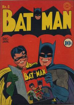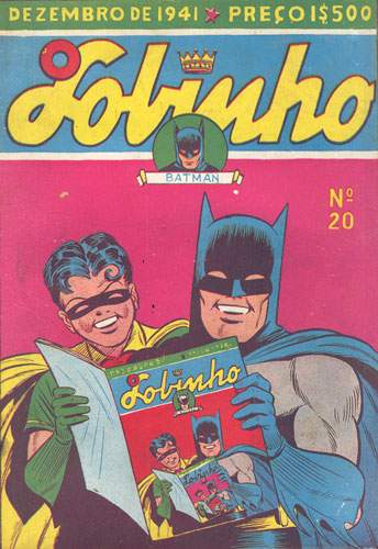 Embaixo vemos uma das primeiras, a do Batman no. 8, datado de dezembro de 1941. Gostaram tanto por aqui que imitaram essa capa no Lobinho do mesmo mês. Na verdade não foi uma publicação simultânea, pois os gibis americanos saíam nas bancas com a data de três meses depois nessa época, então o americano deve ter saído em setembro ou outubro, por isso deu tempo pra eles copiarem aqui. Esse scan do Lobinho que achei está meio esmaecido, mas acho que a impressão era assim mesmo... os gibis americanos eram impressos em papel couchê, por isso as cores brilhavam mais. As capas do Lobinho eram num papel mais fosco.
